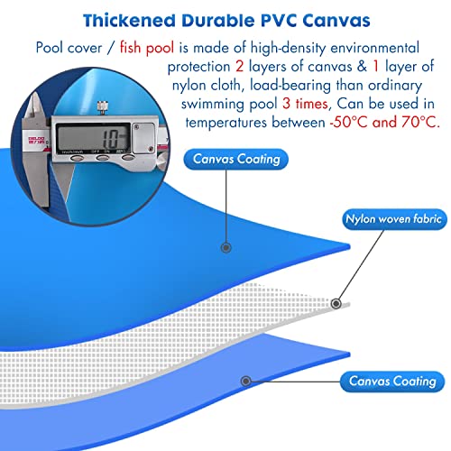- Material de lona de PVC: la piscina sobre el suelo está envuelta con 3 capas de lona resistente a desgarros de 1 mm hechas de PVC de alta densidad en el interior. Tiene la dureza de una piscina de marco ordinaria que no se desvanece y tiene condiciones propicias para la supervivencia de los animales acuáticos. Resuelve el problema de la compra repetida de piscinas y estanques de peces