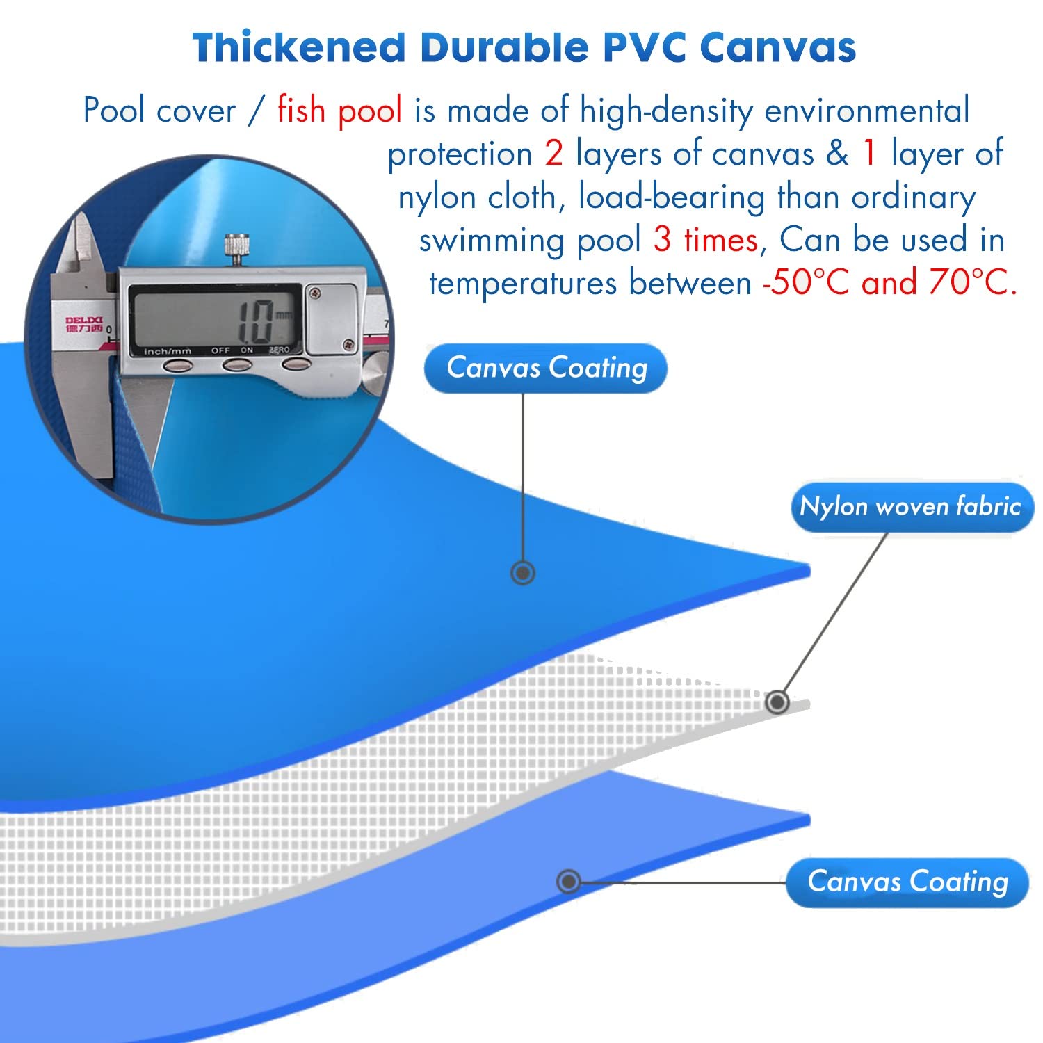 - Material de lona de PVC: la piscina sobre el suelo está envuelta con 3 capas de lona resistente al desgarro hecha de PVC de alta densidad en el interior.Tiene la dureza de una piscina de marco común que no se desvanecerá y tiene condiciones propicias para la supervivencia de los animales acuáticos.Resuelva el problema de la compra repetida de piscinas y estanques de peces.